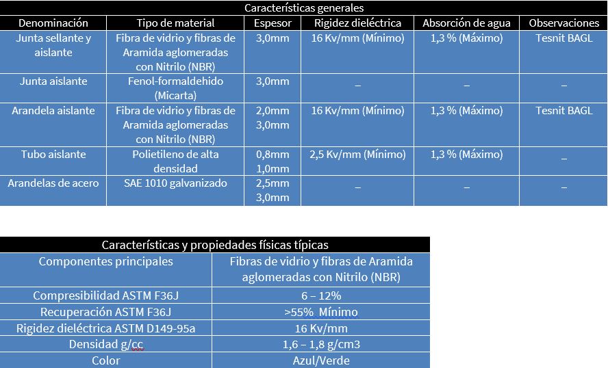 Está constituida por una junta aislante Ring Joint de resina fenólica reforzada (micarta), tubos aislantes de polietileno de alta densidad, arandelas aislantes TESNIT BAGL y arandelas metálicas.